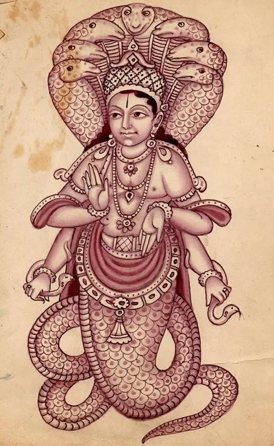 Patanjali is a mystical being who has a human body and the tail of the serpent. He appears to be the reincarnation of Shesha Naga, the mighty serpent, embodying strength, energy, and wisdom. (see a picture of Patanjali below)